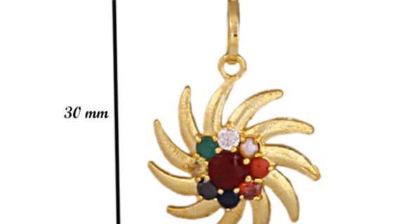 • Spiritual, beautiful Navratana sun locket made up of Pure brass (Panchdhatu) has a great significance in Hindu Mythology which blesses a wearer with luck, Happiness, strength and power and navratana known as 9 gemstone are beautifully stubbed in this sun locket all around to blesses a wearer with dignity, pride, prosperity, and fame.