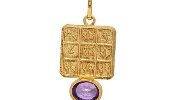 - This Neelam Pendant is made up of Pure Brass (Panchdhatu) and with Neelam gemstone, plated in gold looks very beautiful and elegant.