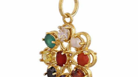 नवरत्न पेंडेंट नौ रत्न के साथ पहनने वाले को आशीर्वाद देता है और सकारात्मक जीवंतता, ज्ञान और समृद्धि को आकर्षित करता