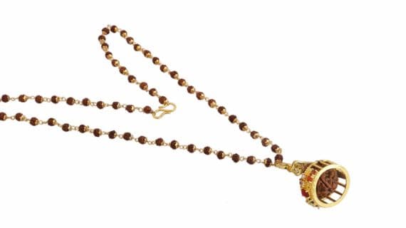 • Rudraksha pendant is made up of pure brass (Panchdhatu) and with rudraksha attached to the pendant, and navratna stubbed in this pendant, plated in gold looks very religious and Spiritual.
