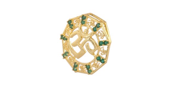 அறுகோண வடிவத்தில் உள்ள இந்த ஓம் எம்பரால்டு பதக்கமானது தூய பித்தளை (பஞ்சதத்து) மற்றும் எம்பரால்டு ரத்தினத்துடன் ஆனது, இந்த பதக்கத்தில் சுற்றிலும், ஓம் சின்னத்திலும் இந்த பதக்கத்தின் மையத்தில் குத்தப்பட்டு, தங்கத்தில் பூசப்பட்டிருப்பது மிகவும் அழகாகவும் ஆன்மீகமாகவும் தெரிகிறது