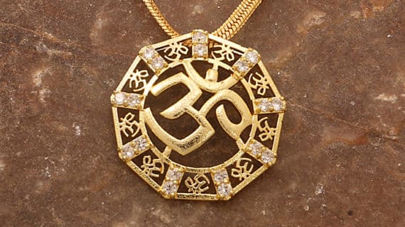 அறுகோண வடிவத்தில் உள்ள இந்த ஓம் சிர்கான் பதக்கமானது தூய பித்தளை (பஞ்சதத்து) மற்றும் இந்த பதக்கத்தில் சுற்றிலும் பிணைக்கப்பட்டுள்ள சிர்கான்களால் ஆனது, தங்கத்தில் பூசப்பட்டிருப்பது மிகவும் அழகாகவும் ஆன்மீகமாகவும் தெரிகிறது