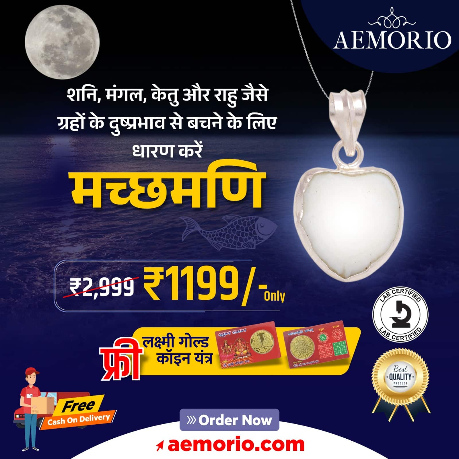 आज ही  मीन मुक्ता / माछ मणि धारण कीजिये  | यह चंद्रमा को बहुत मजबूत बनाता है और इस प्रकार निर्णय लेने की स्थितियों में मदद करता है। शनि, मंगल, केतु और राहु जैसे ग्रहों के दुष्प्रभाव से मदद करता है।