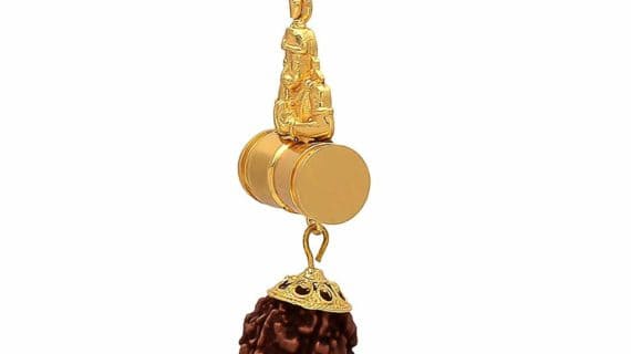 • Hanuman Damru Rudraksha pendant is made up of pure brass (Panchdhatu) and with a statue of Lord Hanuman which is stubbed on a top of damru of this pendant which is tied up with a Rudraksha, plated in gold looks very religious and Spiritual.