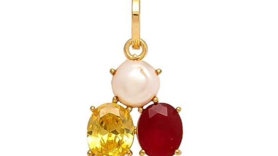 शुद्ध पीतल के पंचधातु से बना और 3 रत्न यानी पीले नीलम, मोती और रूबी से बना यह पेंडेंट सोने में जड़ा हुआ बहुत सुंदर और सुरुचिपूर्ण लगता है।